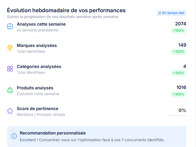 Découvrez comment vos produits, marques et catégories sont perçus par ChatGPT, Gemini, Claude et autres IA génératives. Surveillez les requêtes, les tendances et vos concurrents en temps réel.