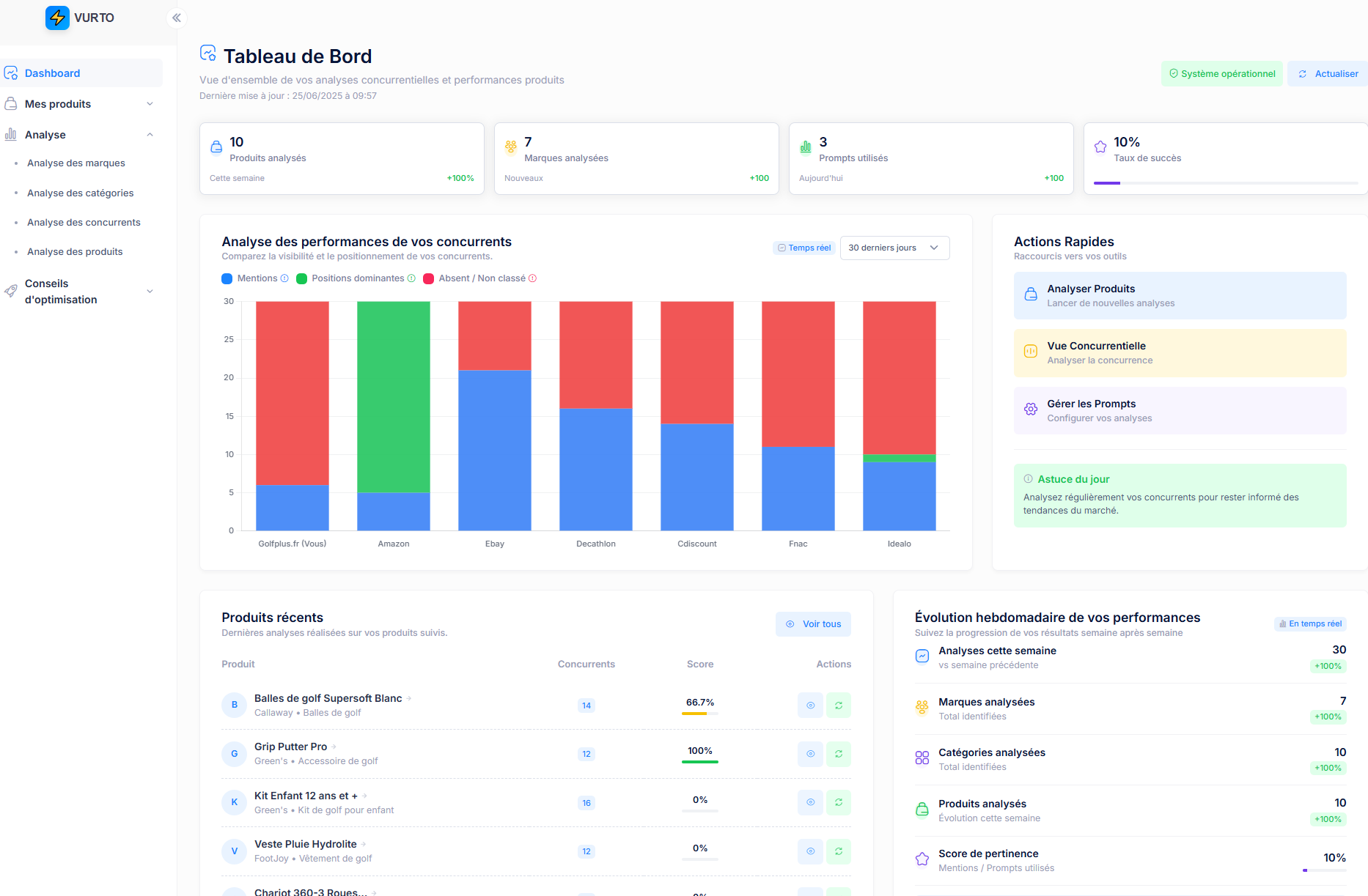 Vurto.ai vous offre une suite complète d’outils pour analyser, surveiller et optimiser la visibilité de vos produits..
